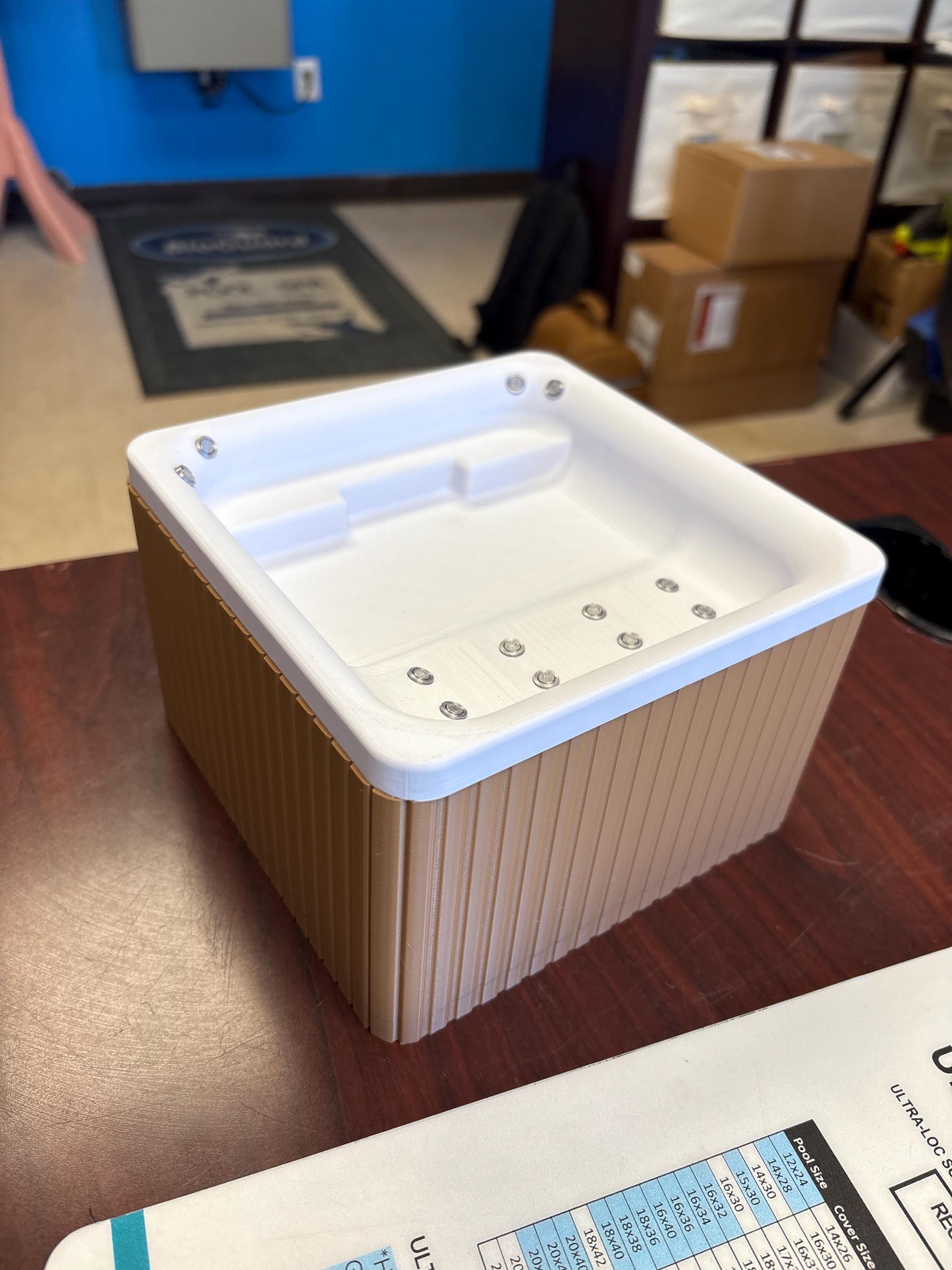 3D Printed hot tub valet can store keys and other accessories. The tub opens up to a large open container to store even more things. Feel free to send me a message if you'd like a color option that isn't listed.